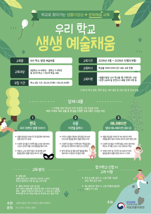 À¯È£ ±¹¸³»ý¹°ÀÚ¿ø°üÀåÀº ¡°À̹ø ¡®¿ì¸® Çб³ »ý»ý ¿¹¼úä¿ò¡¯Àº »ý¹°´Ù¾ç¼º ±³À°À» º¸´Ù »õ·Ó°í âÀÇÀûÀ¸·Î È®ÀåÇϱâ À§ÇÑ Ãâ¹ßÁ¡¡±À̶ó¸ç ¡°Çб³ ÇöÀå¿¡¼ ÇлýµéÀÌ »ý¹°´Ù¾ç¼ºÀÇ °¡Ä¡¸¦ º¸´Ù ½±°í Èï¹Ì·Ó°Ô ¹è¿ì´Â ±âȸ°¡ µÇ±â¸¦ ±â´ëÇÑ´Ù¡±¶ó°í ¹àÇû´Ù.